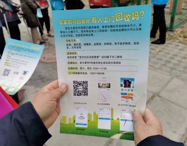在大件可回收点位,垃圾分类第三方宣讲员给居民详细讲解了什么垃圾是可以回收的、怎样回收垃圾、微信注册“首开社区回收管家”小程序的流程,以及怎样用可回收物积分兑换生活用品和抵扣物业费。