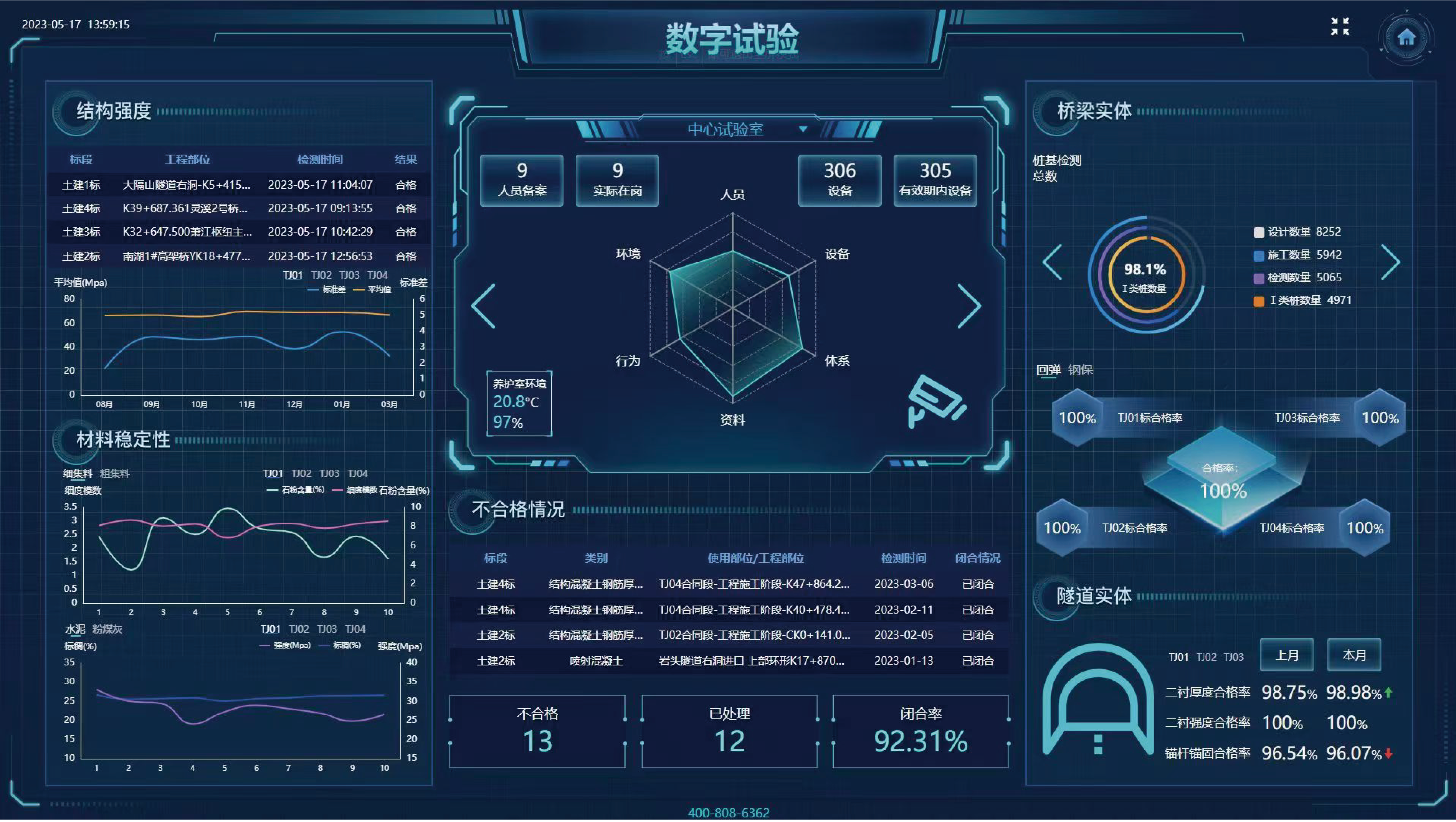 智慧试验室通过试验机数据自动联网采集,配合防篡改存储技术,采用加密存储、操作留痕、影像留痕、红外监控等多重保障措施,确保检测数据的真实性、完整性和可追溯性。标养室温湿度监控与调控功能保证试块养护环境稳定,试验报告无纸化管理显著提高工作效率。